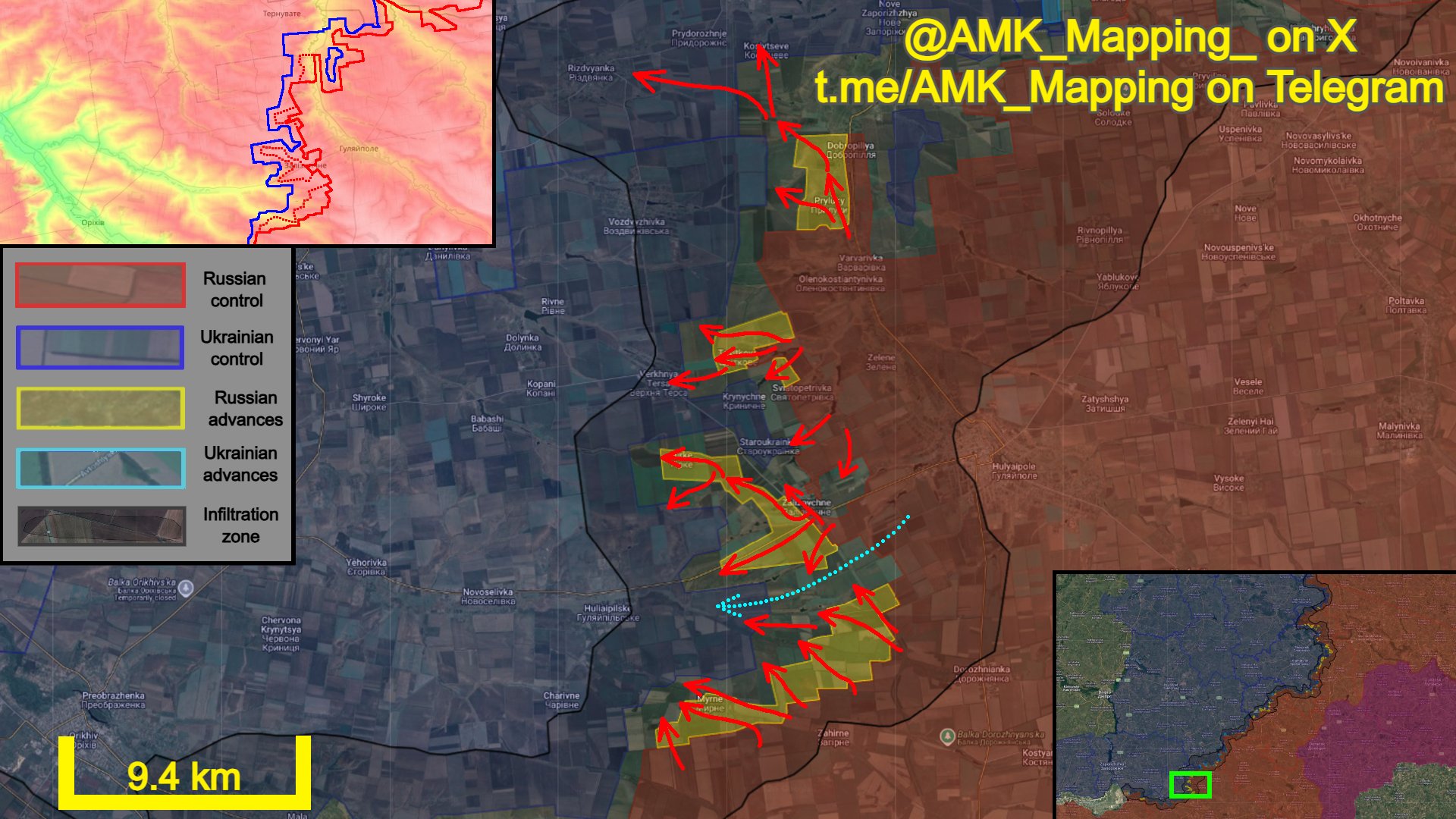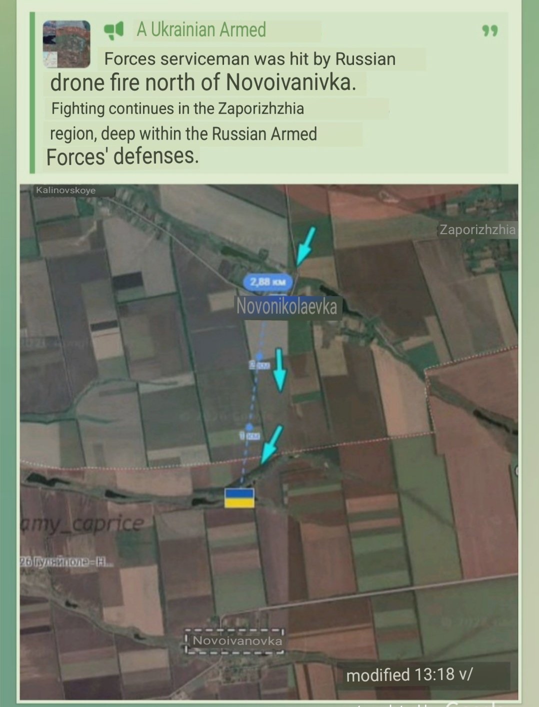 Update on the localized strategic push by Ukrainian forces north of Huliaipole:Geolocated footage confirms Ukrainian presence in the southern part of Novomykolaivka, and even further south just north of Novoivanivka. The latter position has not been consolidated. It can be assumed that Kalynivske is under Ukrainian control, as well as the area south and southwest of it to a certain extent. Simultaneously, Ukrainian forces are fighting for Novohryhorivka. Russians are trying to regain lost positions by sending in reinforcements.