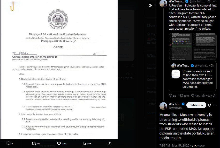 >>530957241Meanwhile, a Moscow university is threatening to withhold diplomas from students who refuse to install the FSB-controlled MAX. No app, no diploma via the state portal, Russian media reports.https://x.com/wartranslated/status/2033265935214145796?s=20>15thpic 1https://files.catbox.moe/dbksta.jpgpic 2https://files.catbox.moe/tqv5qa.jpg