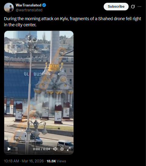 During the morning attack on Kyiv, fragments of a Shahed drone fell right in the city center.https://x.com/wartranslated/status/2033487953532469686?s=20>16thhttps://files.catbox.moe/n2dhta.mp4