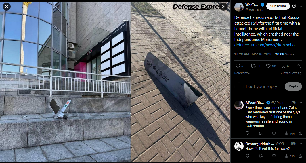 Defense Express reports that Russia attacked Kyiv for the first time with a Lancet drone with artificial intelligence, which crashed near the Independence Monument.https://defence-ua.com/news/dron_scho_vpav_porjad_z_monumentom_nezalezhnosti_tse_lantset_zi_shtuchnim_intelektom_foto-22197.htmlhttps://x.com/wartranslated/status/2033490676306874705?s=20>16th