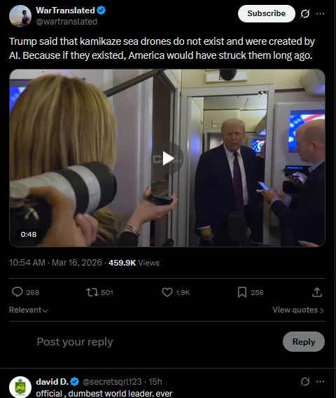 Trump said that kamikaze sea drones do not exist and were created by AI. Because if they existed, America would have struck them long ago.https://x.com/wartranslated/status/2033497141306405353?s=20>16thhttps://files.catbox.moe/hqgj9z.mp4