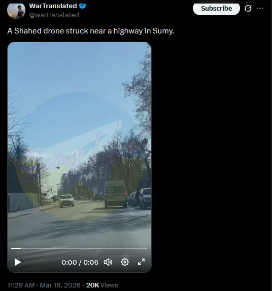 A Shahed drone struck near a highway in Sumy.https://x.com/wartranslated/status/2033505890448343232?s=20>16thhttps://files.catbox.moe/y6mgr2.mp4