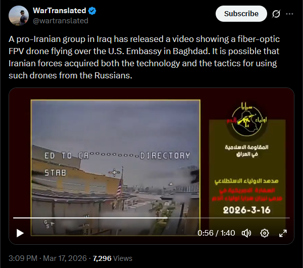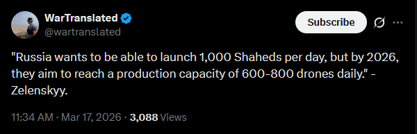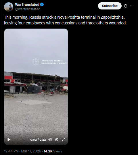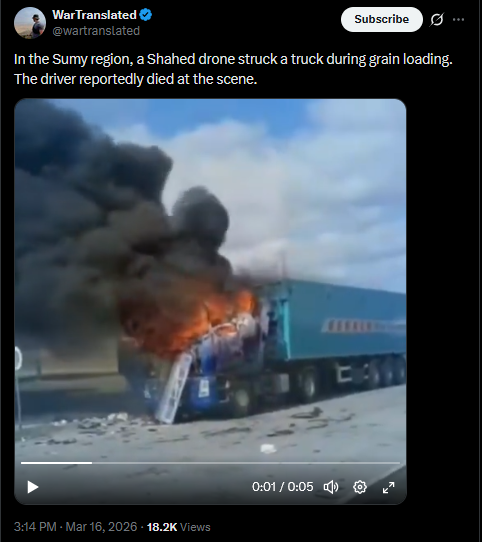 In the Sumy region, a Shahed drone struck a truck during grain loading. The driver reportedly died at the scene.https://x.com/wartranslated/status/2033562551380738524?s=20>16thhttps://files.catbox.moe/bj52hc.mp4