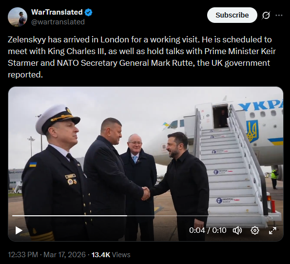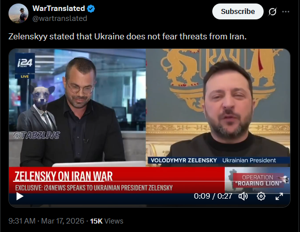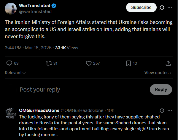 The Iranian Ministry of Foreign Affairs stated that Ukraine risks becoming an accomplice to a US and Israeli strike on Iran, adding that Iranians will never forgive this.https://x.com/wartranslated/status/2033569995800666160?s=20>23h