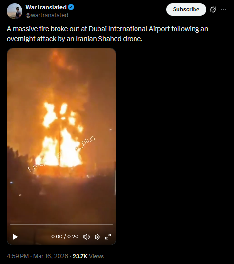 A massive fire broke out at Dubai International Airport following an overnight attack by an Iranian Shahed drone.https://x.com/wartranslated/status/2033588887671468179?s=20>22hhttps://files.catbox.moe/ikwxyv.mp4