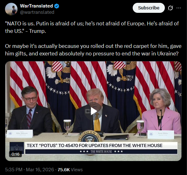 "NATO is us. Putin is afraid of us; he’s not afraid of Europe. He’s afraid of the US." - Trump.Or maybe it's actually because you rolled out the red carpet for him, gave him gifts, and exerted absolutely no pressure to end the war in Ukraine?https://x.com/wartranslated/status/2033598033741377644?s=20>21hhttps://files.catbox.moe/3hvndx.mp4