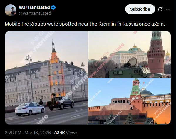 Mobile fire groups were spotted near the Kremlin in Russia once again.https://x.com/wartranslated/status/2033611432818815386?s=20>20hpic 1https://files.catbox.moe/3k2jfi.jpgpic 2https://files.catbox.moe/4zwlr4.jpgpic 3https://files.catbox.moe/v72jjk.jpg