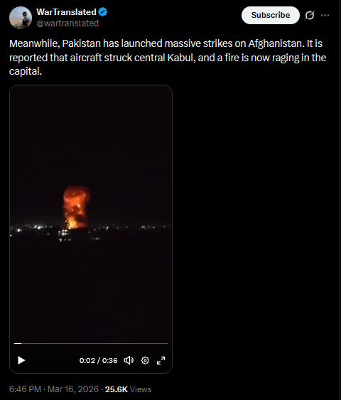 Meanwhile, Pakistan has launched massive strikes on Afghanistan. It is reported that aircraft struck central Kabul, and a fire is now raging in the capital.https://x.com/wartranslated/status/2033615913904160805?s=20>20hhttps://files.catbox.moe/qbhjtq.mp4
