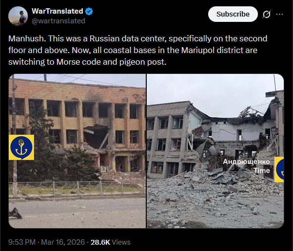 >>530955090>>530958519Manhush. This was a Russian data center, specifically on the second floor and above. Now, all coastal bases in the Mariupol district are switching to Morse code and pigeon post.https://x.com/wartranslated/status/2033662966088810952?s=20>17hpic 1https://files.catbox.moe/x1989a.jpgpic 2https://files.catbox.moe/34u1ug.jpg>>530958540 it's been going on for three weeks, no body noticed