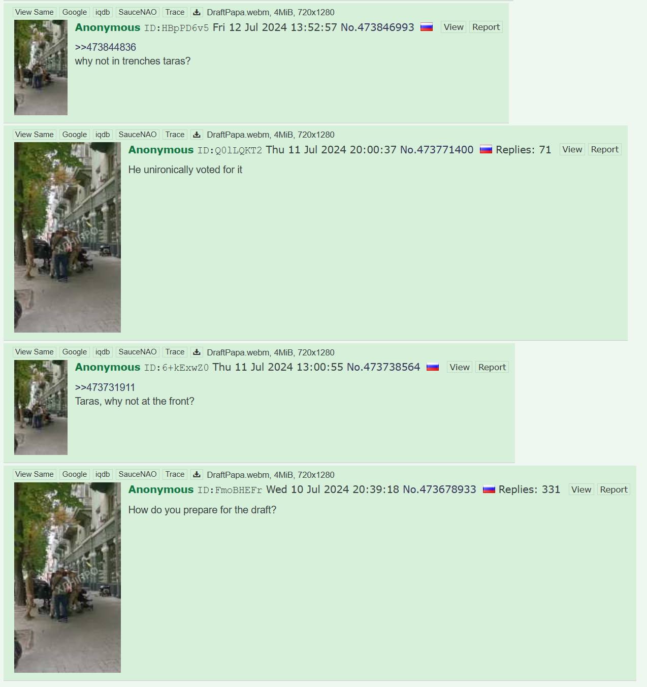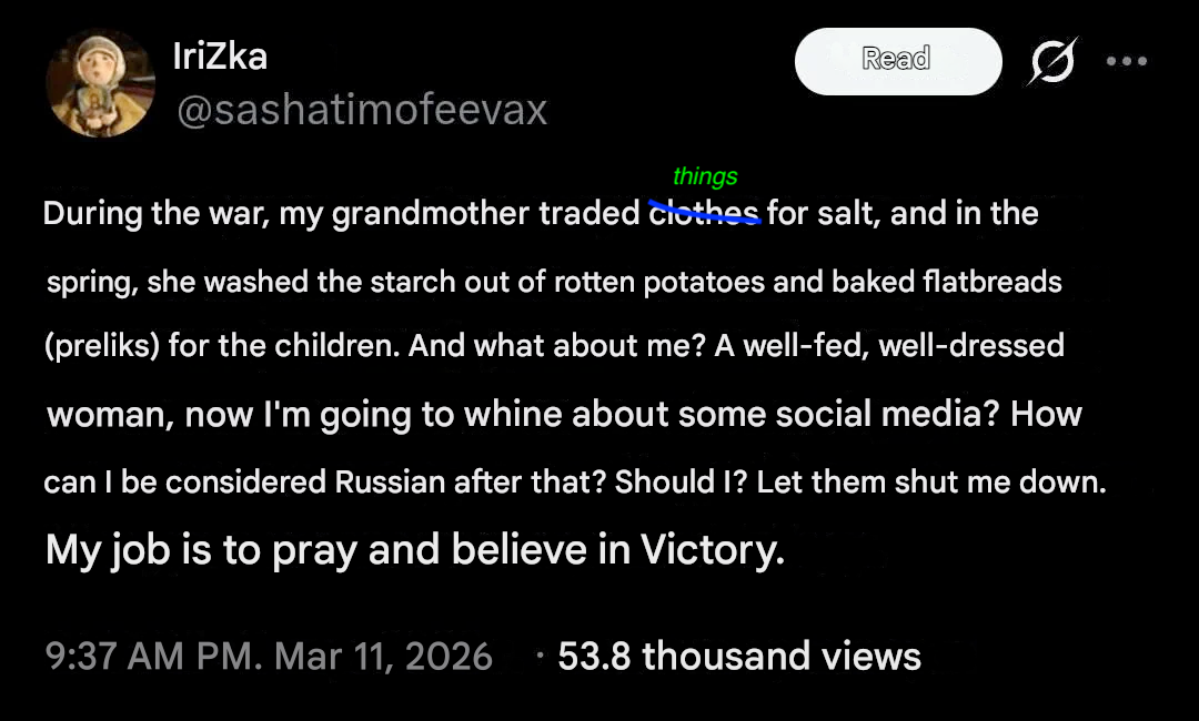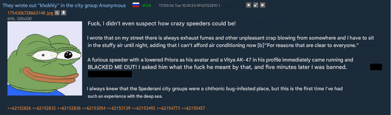 >>530955090Russia continues to roll back in time. State Duma Deputy Svintsov stated that the lack of mobile internet is no big deal, as one can always return to landlines. From there, pigeon post isn't far off.https://x.com/wartranslated/status/2033659813683442087?s=20>17hhttps://files.catbox.moe/qg0o2b.mp4