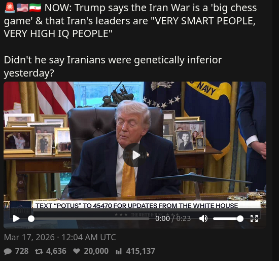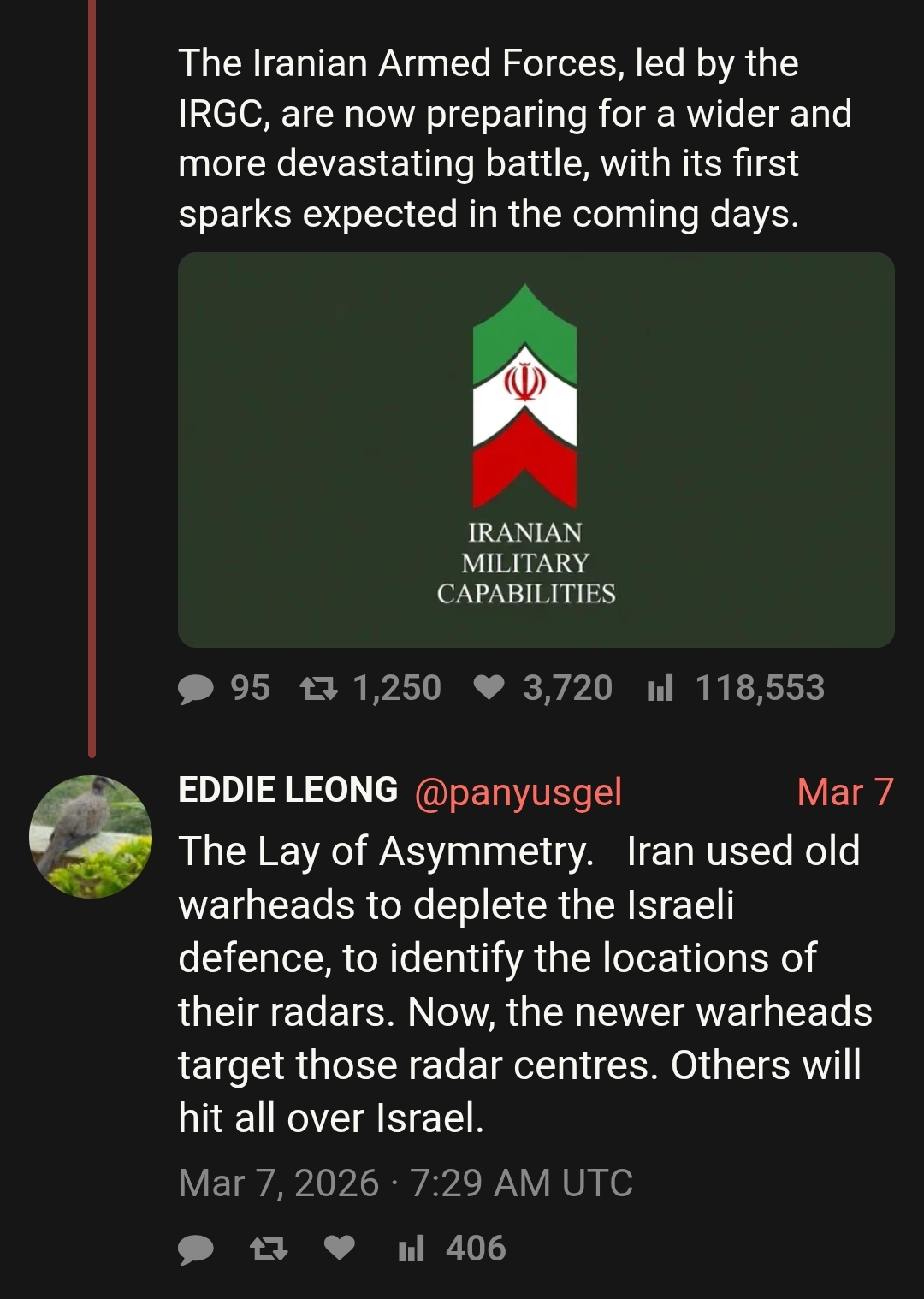 >Iran’s Revolutionary Guards: “We have conveyed to those who threaten us with a nuclear attack that we will respond with whatever we are threatened with.”https://x.com/GlobalIJournal/status/2033729176734159326don't see credible sources for the tweet though, so maybe faketho there was a similar one a little while back:>former Iranian diplomat: Iran has been threatened with a nuclear strike>Amir al-Mousawi emphasized that the country has affirmed that any nuclear attack would be met with a proportional responsehttps://x.com/MayadeenEnglish/status/1823760679502852336