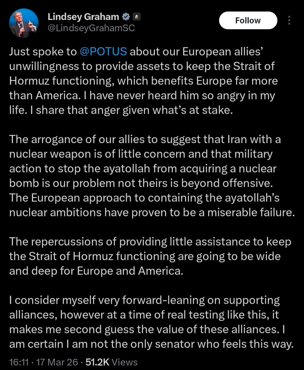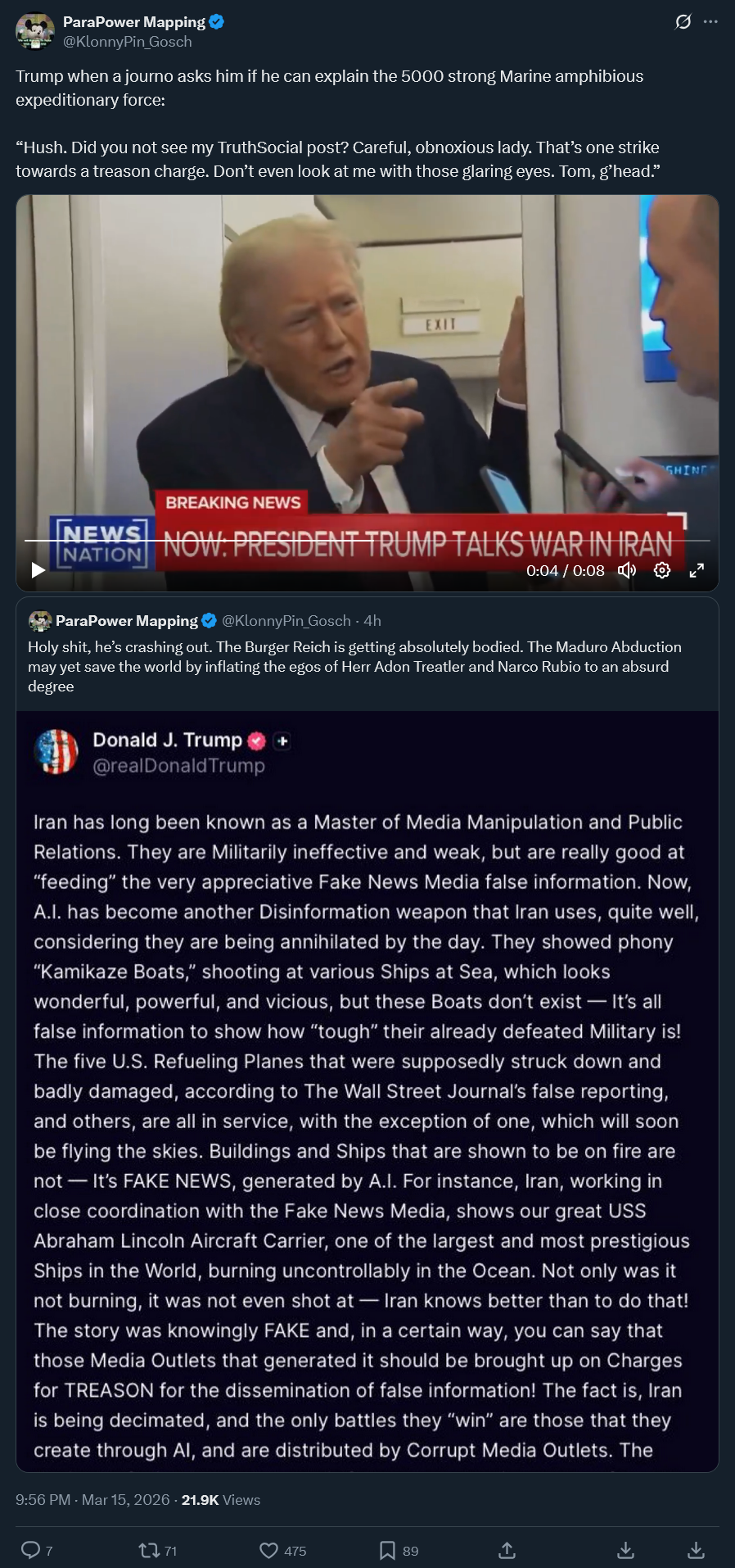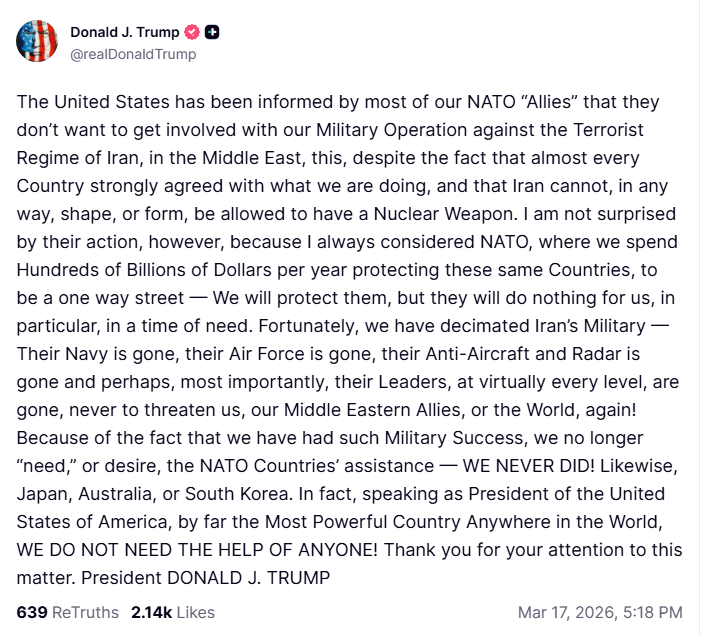 trump, sounds like it might be his last tweet"The United States has been informed by most of our NATO “Allies” that they don’t want to get involved with our Military Operation against the Terrorist Regime of Iran, in the Middle East, this, despite the fact that almost every Country strongly agreed with what we are doing, and that Iran cannot, in any way, shape, or form, be allowed to have a Nuclear Weapon.I am not surprised by their action, however, because I always considered NATO, where we spend Hundreds of Billions of Dollars per year protecting these same Countries, to be a one way street — We will protect them, but they will do nothing for us, in particular, in a time of need. Fortunately, we have decimated Iran’s Military — Their Navy is gone, their Air Force is gone, their Anti-Aircraft and Radar is gone and perhaps, most importantly, their Leaders, at virtually every level, are gone, never to threaten us, our Middle Eastern Allies, or the World, again!Because of the fact that we have had such Military Success, we no longer “need,” or desire, the NATO Countries’ assistance — WE NEVER DID!Likewise, Japan, Australia, or South Korea. In fact, speaking as President of the United States of America, by far the Most Powerful Country Anywhere in the World, WE DO NOT NEED THE HELP OF ANYONE! Thank you for your attention to this matter. President DONALD J. TRUMP" - Trump via Truth Social.[TT]