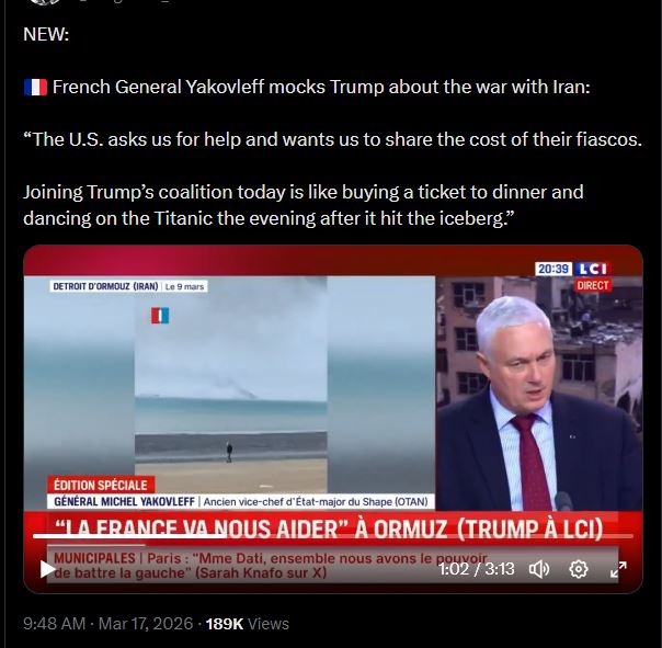 >NEW:>French General Yakovleff mocks Trump about the war with Iran:>“The U.S. asks us for help and wants us to share the cost of their fiascos.>Joining Trump’s coalition today is like buying a ticket to dinner and dancing on the Titanic the evening after it hit the iceberg.”nitter.net/Megatron_ron/status/2033827883097923623