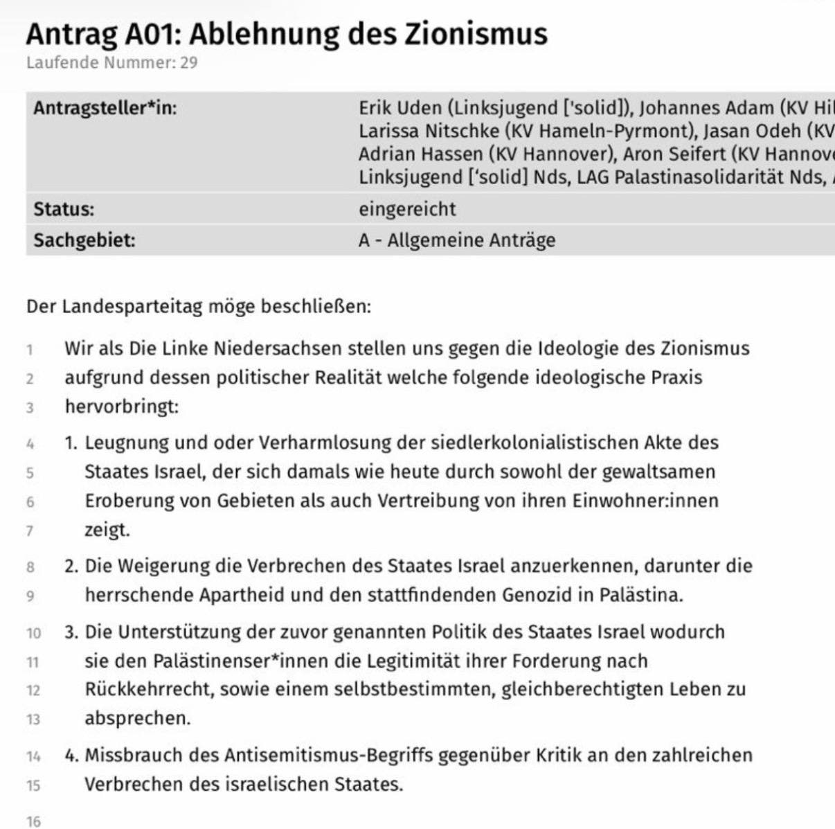 > Germany’s The Left party is facing a major internal crisis after adopting a motion rejecting Zionism and accusing Israel of “apartheid”, “settler colonialism” and “genocide”.>Efforts to soften the wording were voted down.>Brandenburg’s Anti-Semitism Commissioner Andreas Büttner has now quit, warning of deep divisions over Israel and anti-Semitism.