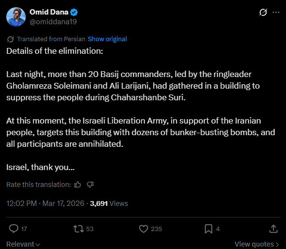 Previous: >>530954776Timeline:▶ Day: 17>The national counterterrorism director, Joe Kent, resigns, citing his opposition to the war>Ali Larijani and commander of Basij are dead, says Israel>Mojtaba Khamenei is gay (source: NY post & khazarian tranny)>US allies rebuff Trump's request for support in Strait of Hormuz>IDF 91st division has begun focused ground activity in southern Lebanon>The nuclear facility Parchin south of Tehran was attacked using bunker-buster bombs>Financial Times reports that the U.S. has told its European allies that deliveries of the U.S. arms they are buying for Ukraine may be delayed.>President Trump warned NATO that it faces a "very bad future" if it does not help the US open the Strait of Hormuz>Iran "open to countries who want to talk" about safe passage through the Strait of Hormuz>Japan tacitly refuses to send ships to the Strait of Hormuz>France rejects Trump's request to send warships to the Strait of Hormuz>Missiles and drones chase Americans out of Iraq>Iraqi militias release FPV drone footage operating above the U.S. Victoria military base near Baghdad International Airport.▶Livestreamshttps://www.youtube.com/watch?v=4E-iFtUM2kkhttps://www.youtube.com/watch?v=JHwwZRH2wz8 ▶Telegramhttps://rentry.org/tgnews▶Twitter accountshttps://nitter.net/clashreporthttps://nitter.net/FaytuksNetworkhttps://nitter.net/sentdefender▶Israel Rocket Alertshttps://www.tzevaadom.co.il/en/▶Air Traffichttps://www.flightradar24.com/https://flightaware.com/livehttps://globe.adsbexchange.com▶Maritime Traffichttps://www.marinetraffic.com/https://www.vesselfinder.com/