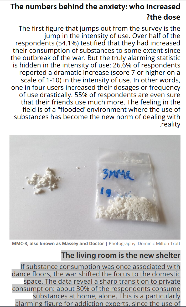 >>530962148The living room is the new shelterIf substance consumption was once associated with dance floors, the war shifted the focus to the domestic space. The data reveal a sharp transition to private consumption: about 30% of the respondents consume substances at home, alone. This is a particularly alarming figure for addiction experts, since the use of solitude significantly increases the chance of developing mental and physical dependence, and decreases the chance of assistance in the event of a medical complication.The list of ingredients has also changed: while alcohol remains at the top (49%), it is no longer alone. The "Doctor"(Memsi) is right behind him with 44% consumption, and becomes the favorite refuge substance for many who are looking for a quick break from anxiety (remember that we recently discovered that MMC sometimes contains completely different substances). Right after them on the list are cannabis (37%), cocaine (28%