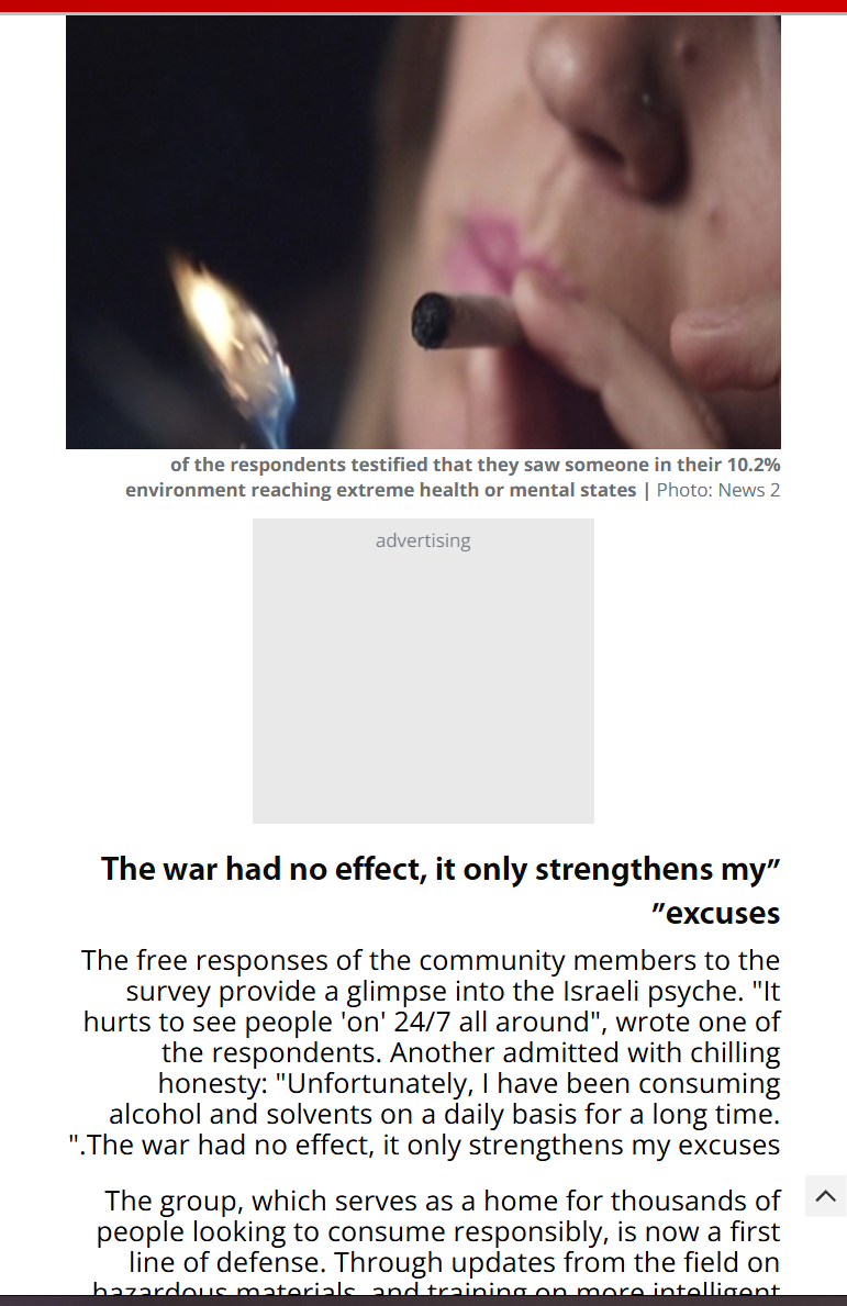 "The war had no effect, it only strengthens my excuses"The free responses of the community members to the survey provide a glimpse into the Israeli psyche. "It hurts to see people 'on' 24/7 all around", wrote one of the respondents. Another admitted with chilling honesty: "Unfortunately, I have been consuming alcohol and solvents on a daily basis for a long time. The war had no effect, it only strengthens my excuses."The group, which serves as a home for thousands of people looking to consume responsibly, is now a first line of defense. Through updates from the field on hazardous materials, and training on more intelligent use, and the attempt to minimize damages. While constantly emphasizing that the safest way is to completely avoid consuming mainly substances that are not only dangerous, but sometimes even illegal.The disclosure of the data makes it clear that Israel 2026 is facing a mental health crisis fueled by psychoactive substances. The surge in consumption among adults, the transition to single use at home, and the lack of testing of the ingredients create a ticking time bomb. The day after the war, we will find even more strongly that we are left with an entire population that needs more information, knowledge about damage minimization and ways to protect themselves the day after.