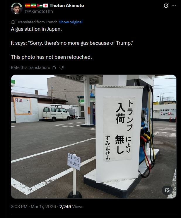 >A gas station in Japan.>It says: "Sorry, there's no more gas because of Trump.">This photo has not been retouched.