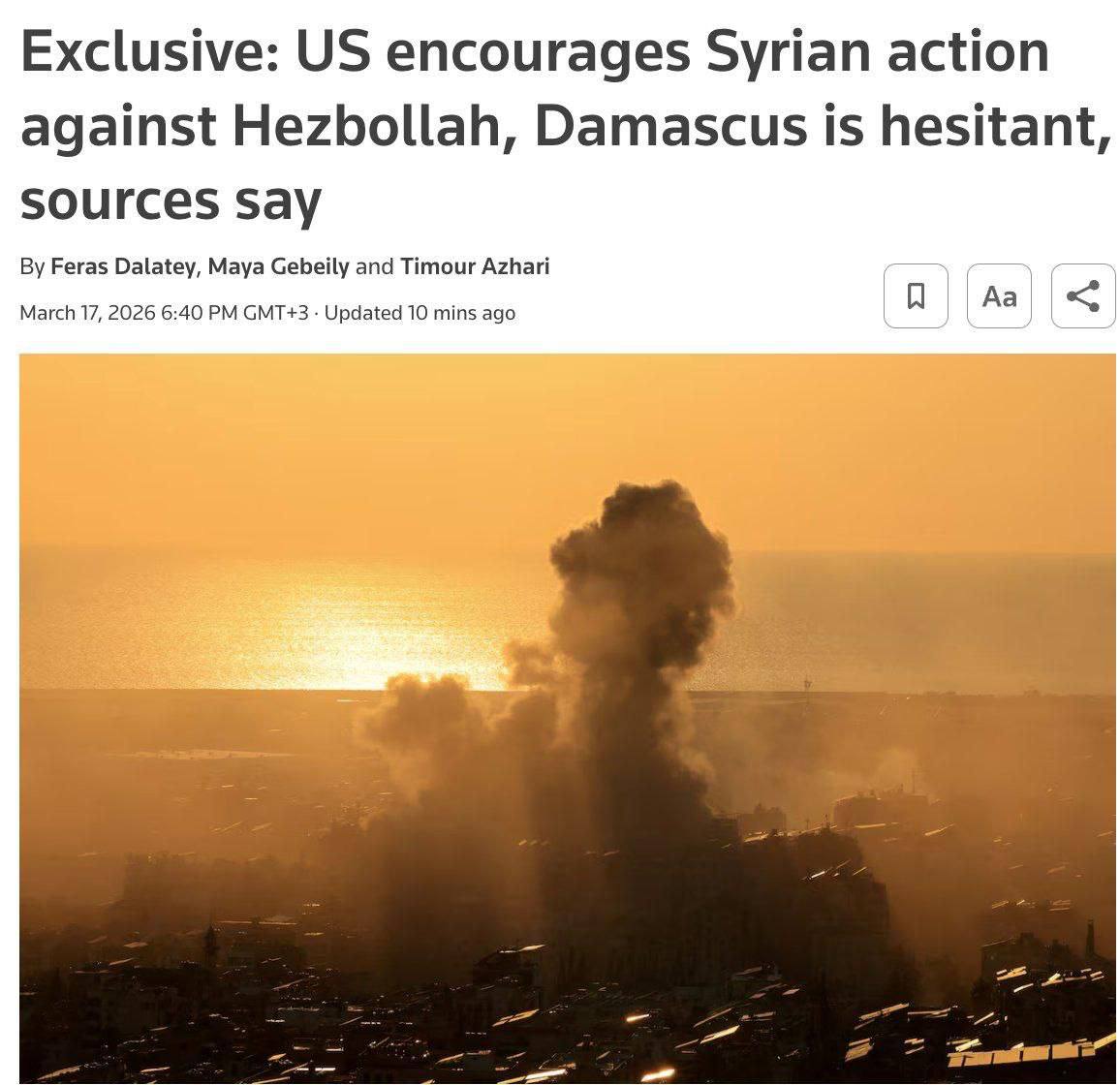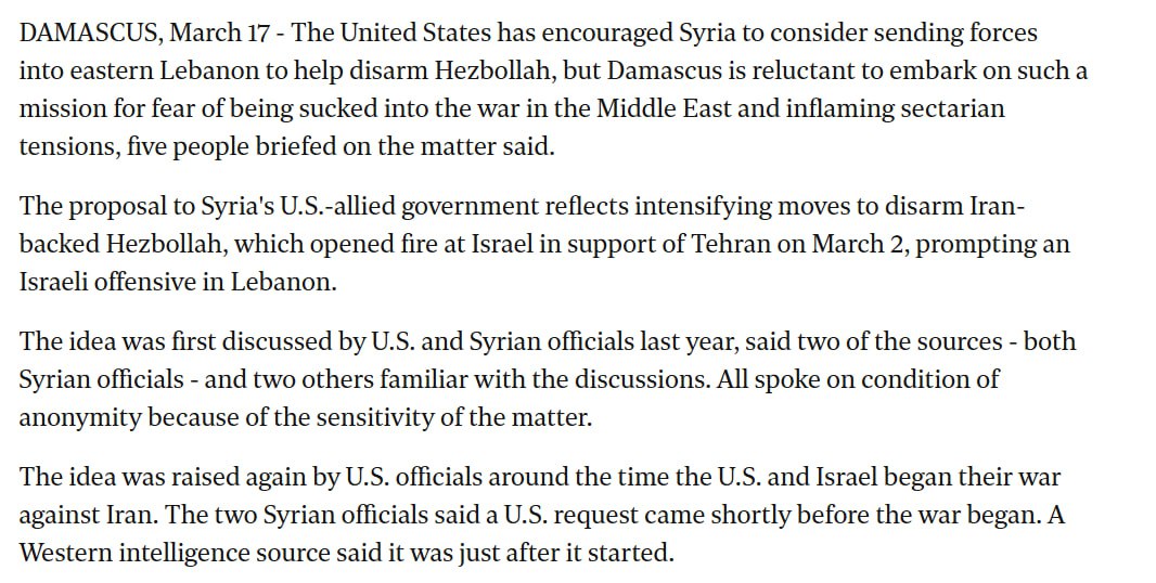NEW: The United States has encouraged Syria to consider deploying forces into eastern Lebanon to help disarm Hezbollah, according to sources briefed on the matter.Damascus is reportedly reluctant, citing fears of being drawn deeper into the regional war and inflaming sectarian tensions. — ReutersSYRIA HEEEEEEEEELP MEEEE