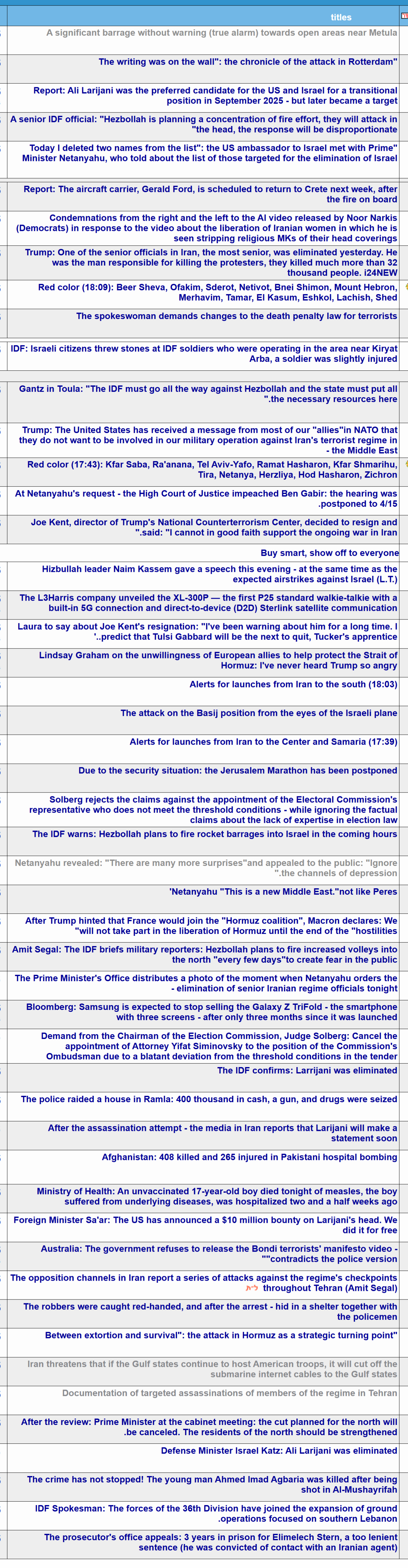Previous: >>530958184Timeline:▶ Day: 17>The national counterterrorism director, Joe Kent, resigns, citing his opposition to the war>Ali Larijani and commander of Basij are dead, says Israel>Mojtaba Khamenei is gay (source: NY post & khazarian tranny)>US allies rebuff Trump's request for support in Strait of Hormuz>IDF 91st division has begun focused ground activity in southern Lebanon>The nuclear facility Parchin south of Tehran was attacked using bunker-buster bombs>Financial Times reports that the U.S. has told its European allies that deliveries of the U.S. arms they are buying for Ukraine may be delayed.>President Trump warned NATO that it faces a "very bad future" if it does not help the US open the Strait of Hormuz>Iran "open to countries who want to talk" about safe passage through the Strait of Hormuz>Japan tacitly refuses to send ships to the Strait of Hormuz>France rejects Trump's request to send warships to the Strait of Hormuz>Missiles and drones chase Americans out of Iraq>Iraqi militias release FPV drone footage operating above the U.S. Victoria military base near Baghdad International Airport.▶Livestreamshttps://www.youtube.com/watch?v=4E-iFtUM2kkhttps://www.youtube.com/watch?v=JHwwZRH2wz8 ▶Telegramhttps://rentry.org/tgnews▶Twitter accountshttps://nitter.net/clashreporthttps://nitter.net/FaytuksNetworkhttps://nitter.net/sentdefender▶Israel Rocket Alertshttps://www.tzevaadom.co.il/en/▶Air Traffichttps://www.flightradar24.com/https://flightaware.com/livehttps://globe.adsbexchange.com▶Maritime Traffichttps://www.marinetraffic.com/https://www.vesselfinder.com/