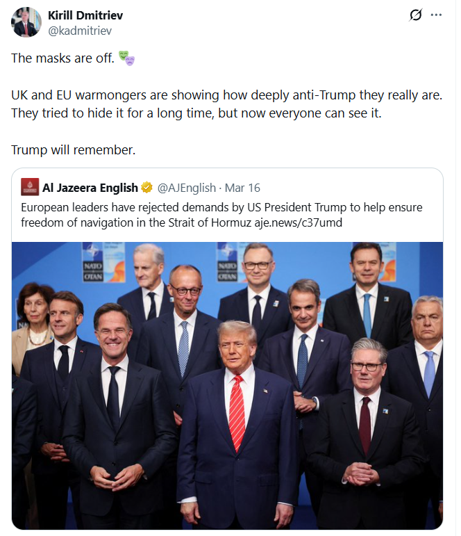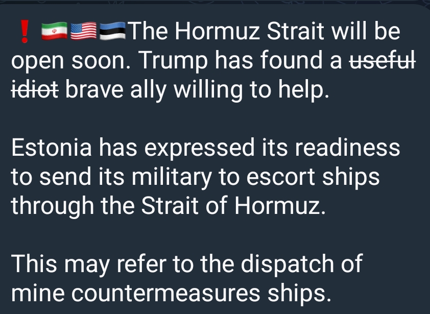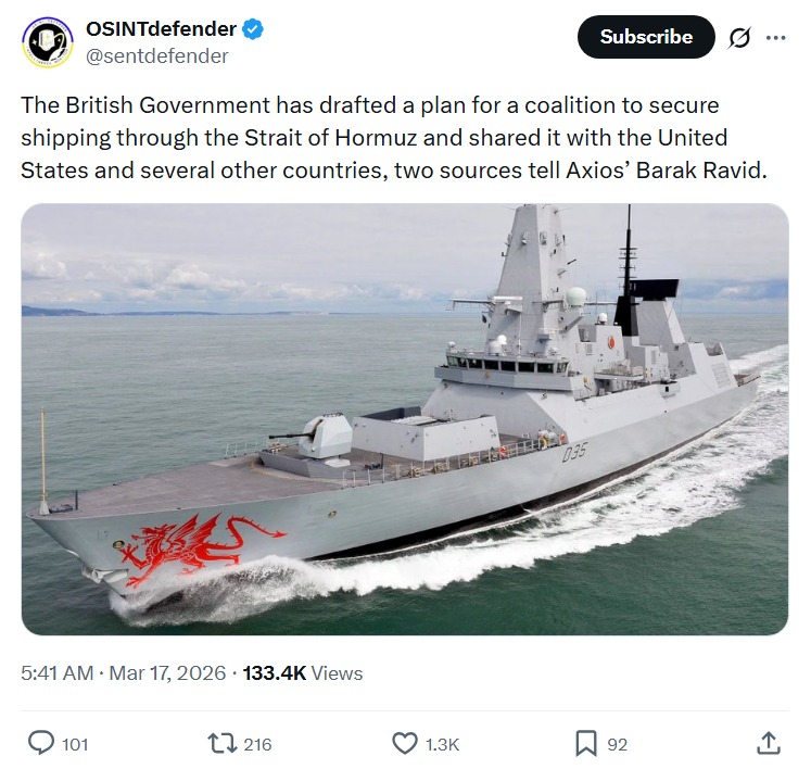 https://x.com/sentdefender/status/2033886480293118068?s=20>The British Government has drafted a plan for a coalition to secure shipping through the Strait of Hormuz and shared it with the United States and several other countries, two sources tell Axios’ Barak Ravid.IRGX sisses... there's a coalition building up against us... i-i think it's over..