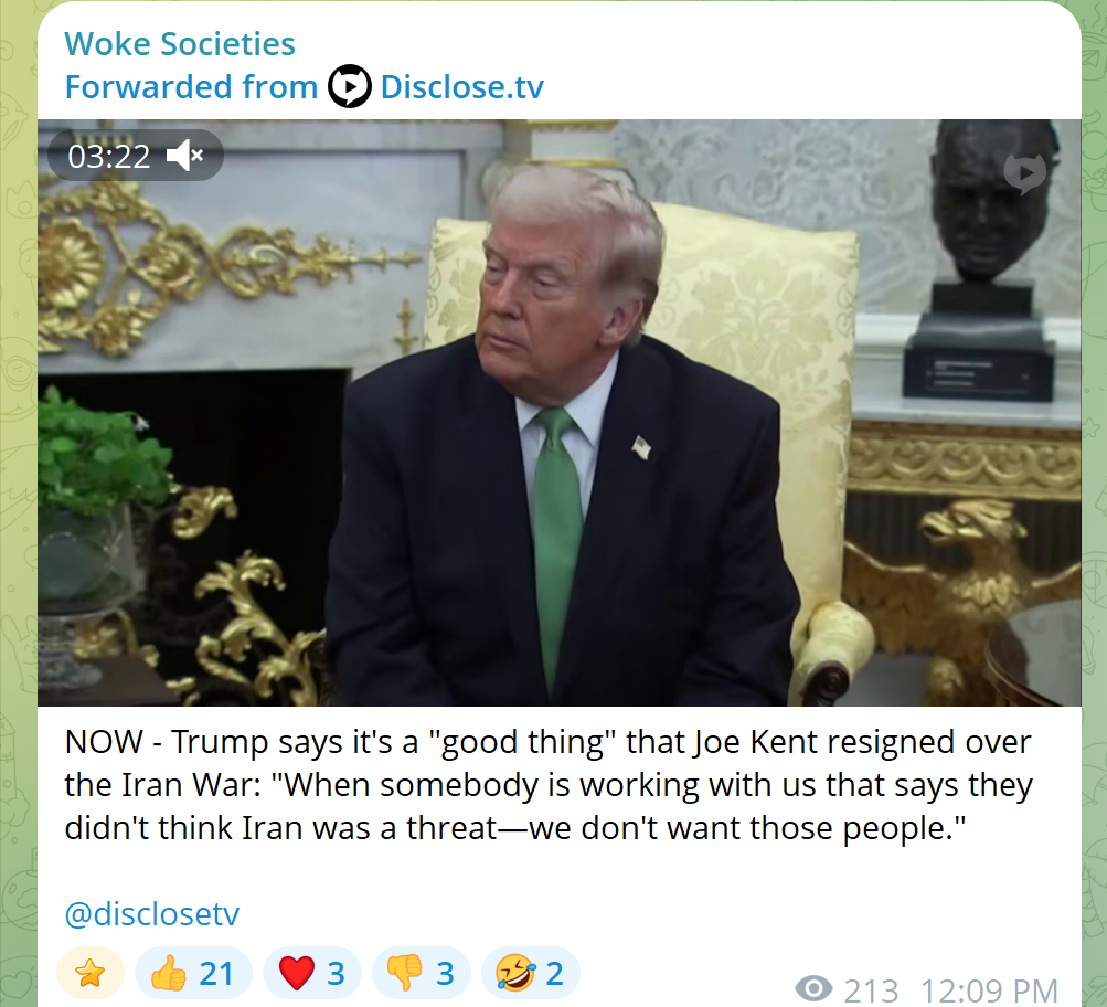 >The national counterterrorism director, Joe Kent, resigns>Joe Kent a former special forces soldier joined the administration in support of its no new wars policy Sweet, boots on the ground it is