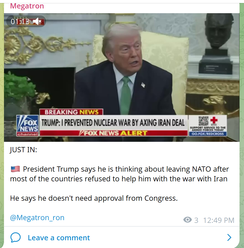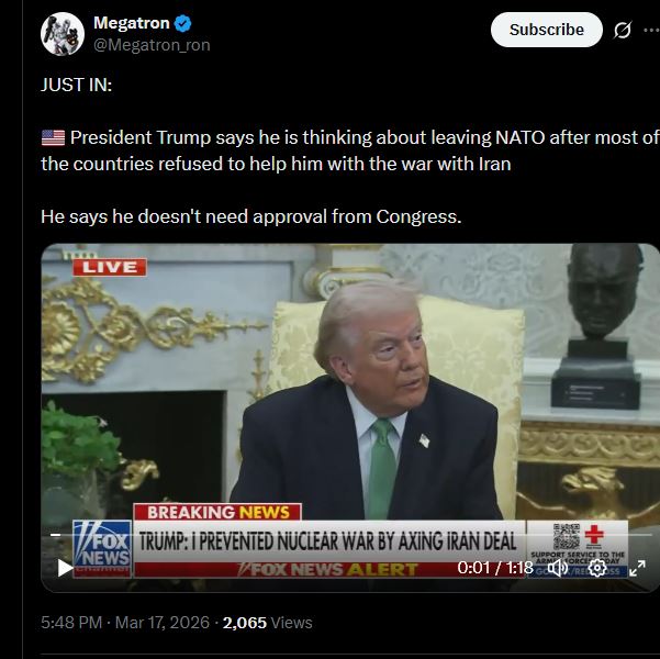 JUST IN: President Trump says he is thinking about leaving NATO after most of the countries refused to help him with the war with IranHe says he doesn't need approval from Congress.