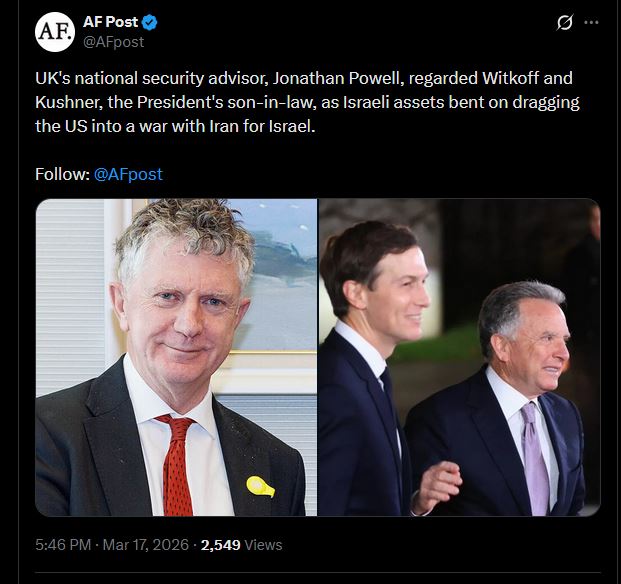 >UK's national security advisor, Jonathan Powell, regarded Witkoff and Kushner, the President's son-in-law, as Israeli assets bent on dragging the US into a war with Iran for Israel.