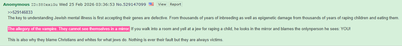 Dealing with Zionist Jews is genuinely one of the most mindfucking experiences imaginable. They're genuinely, the single most narcissistic, bad faith, delusional, entitled fucks, i've ever dealt with in my life and I've had THREE housemates diagnosed with BPD.That is actually what they remind me of, bad faith Cluster B disorder people who live in a total fucking fantasy world where they spit venom and say and do terrible things, then play the victim. With my BPD housemates, you couldn't call them out because their mind process was "Why is he saying I did wrong by stealing his thing? He is trying to make me feel bad and hurt me, so actually he's the one in the wrong, and I need to attack him!". Every time I tried to set boundaries, or call out my housemates, they always played this bullshit flip around card, and they genuinely deluded themselves into thinking they were right.This is the same behaviour I see with Zionist Jews. They do terrible things (doxx people, smear others, cry antisemitism at nothing, lawfare, defend genocide, call people subhuman goyim etc) then pull the victim card and genuinely believe they are in the right when you call them out. The whole card they've been pulling the past few years is "Antisemitism is the only form of bigotry not taken seriously, anything us Jews says is antisemitism is" The worst part is, the entire fucking media, the entire establishment SIDE WITH THEM.If Judaism was a new age cult I would be watching their purchases for cool aid because they are that fucking nuts.