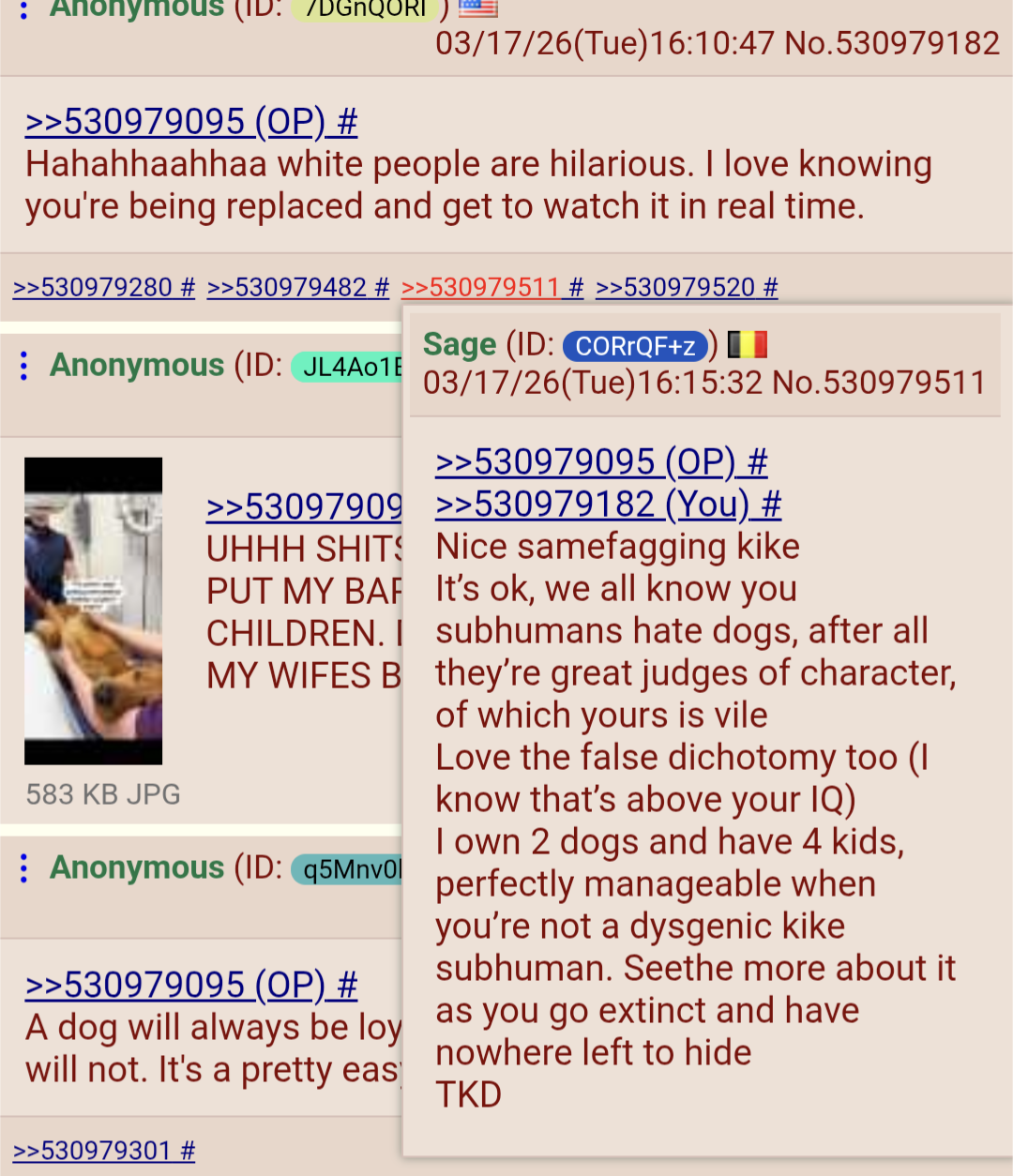 >>530979095>>530979182Nice samefagging kikeIt’s ok, we all know you subhumans hate dogs, after all they’re great judges of character, of which yours is vileLove the false dichotomy too (I know that’s above your IQ)I own 2 dogs and have 4 kids, perfectly manageable when you’re not a dysgenic kike subhuman. Seethe more about it as you go extinct and have nowhere left to hideTKD