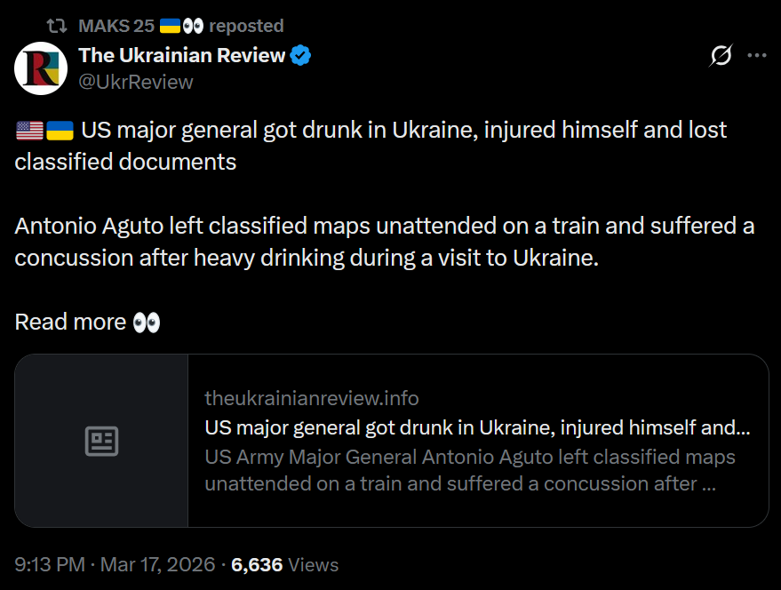 >US major general got drunk in Ukraine, injured himself and lost classified documents>Antonio Aguto left classified maps unattended on a train and suffered a concussion after heavy drinking during a visit to Ukraine.LOLOLOLOL