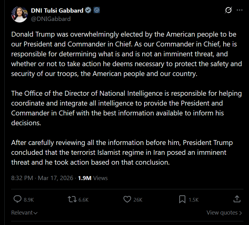 So when is Trump going to showcase the imminent threat of Iran?He has evidence... right?Also lol at Tulsi refusing to confirm if there was a threat or not.