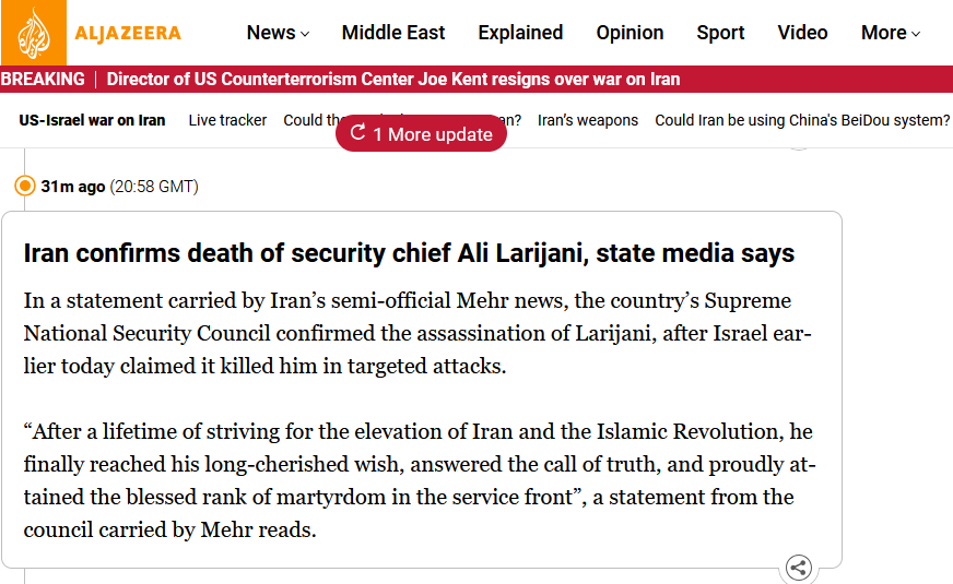 >larjani dead>Soleimani deadI hope this teaches you to never doubt Israelis claims. I am sure even the new Khamenei is dead but Iranians don't want to reveal it