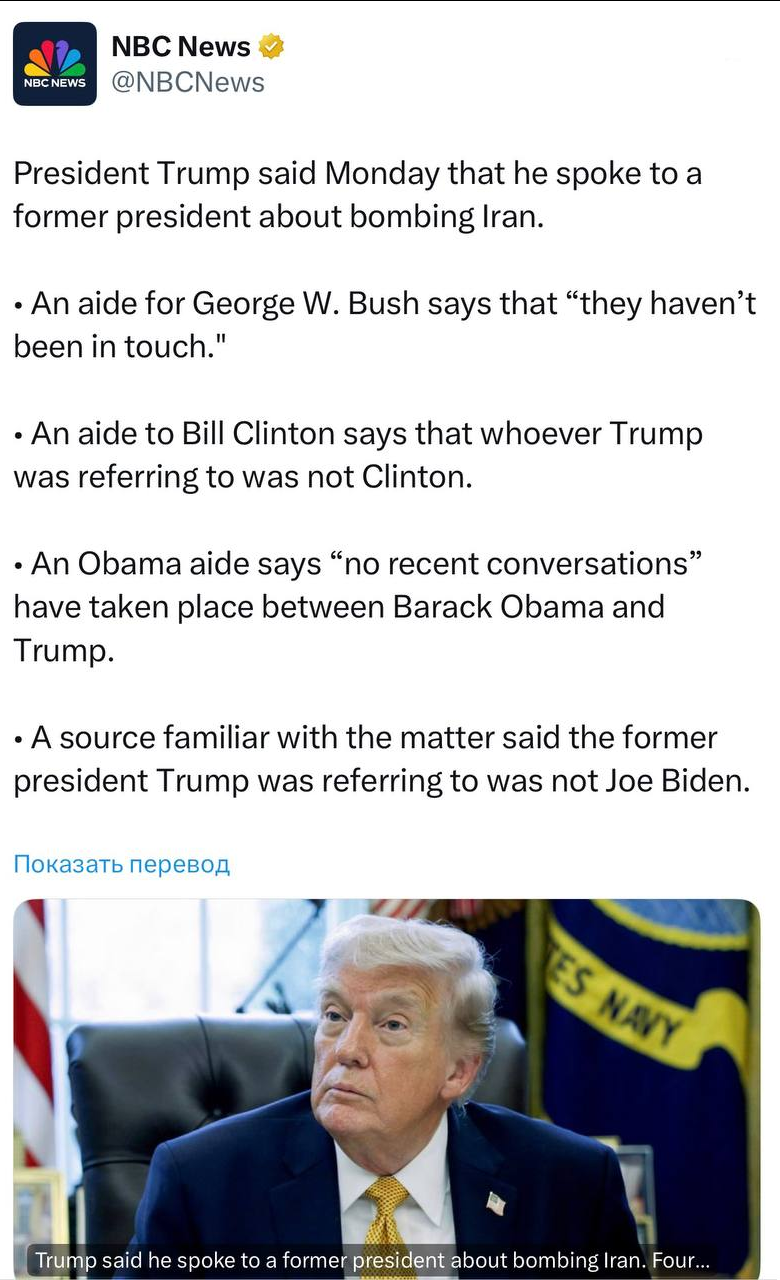 Trump has completely lost his mind: Trump discussed bombing Iran with himselfYesterday, Trump claimed he discussed bombing Iran with a "former US president," who, according to him, responded, "I wish I had done it myself."Today, representatives for Bill Clinton, George W. Bush, and Barack Obama stated that their son-in-law never discussed such things with them, and given Trump's dislike of Biden, he was most likely talking to himself (the 45th US president).