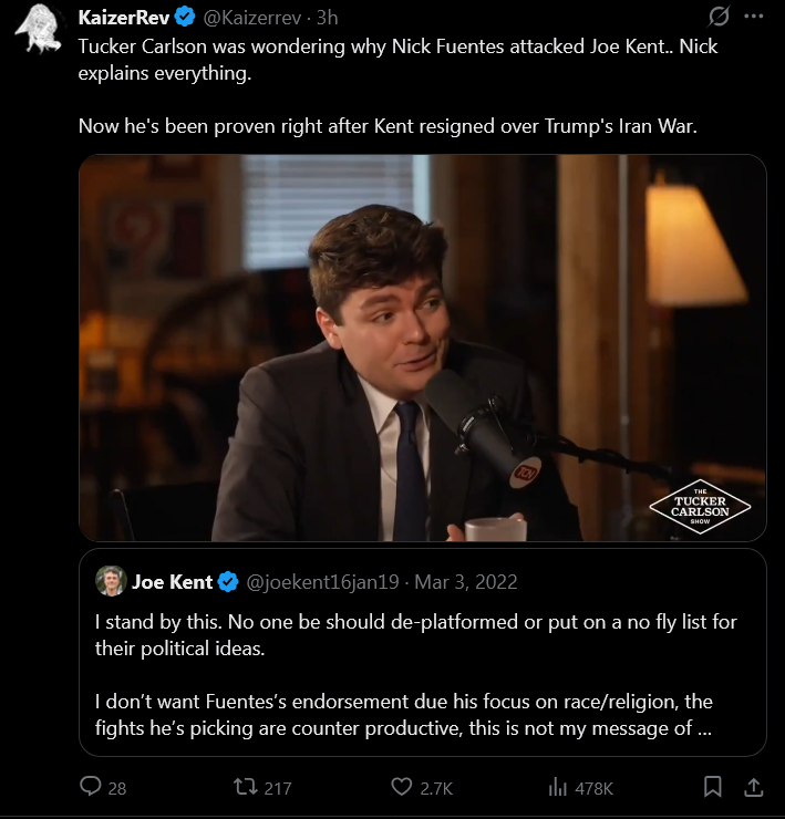 lmfao>New: Joe Kent is expected to record a live episode of The Tucker Carlson Show on Wednesday, where he will elaborate on his opposition to the U.S.-Israel war in Iranhahahahha what a fucking faggot he's already on the podcast circuit