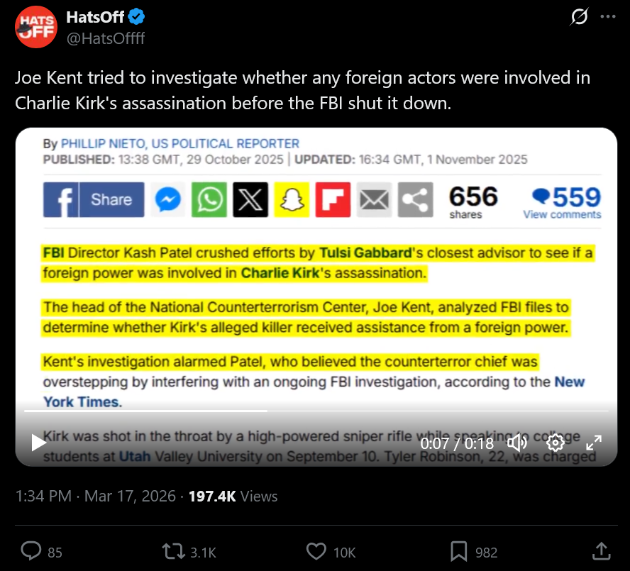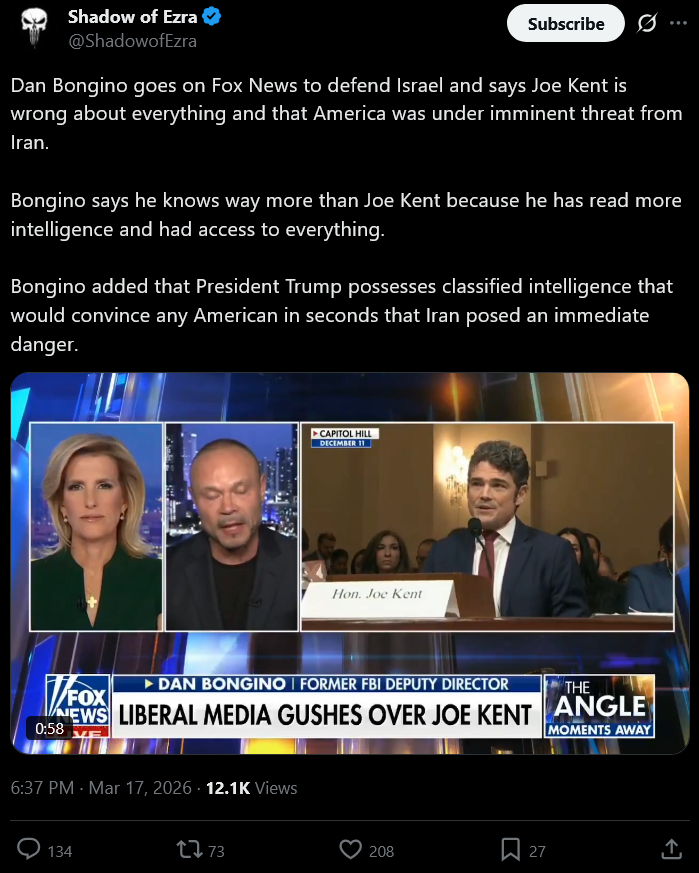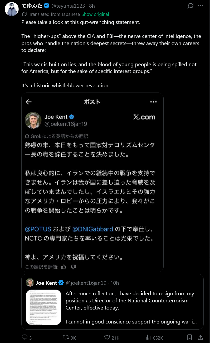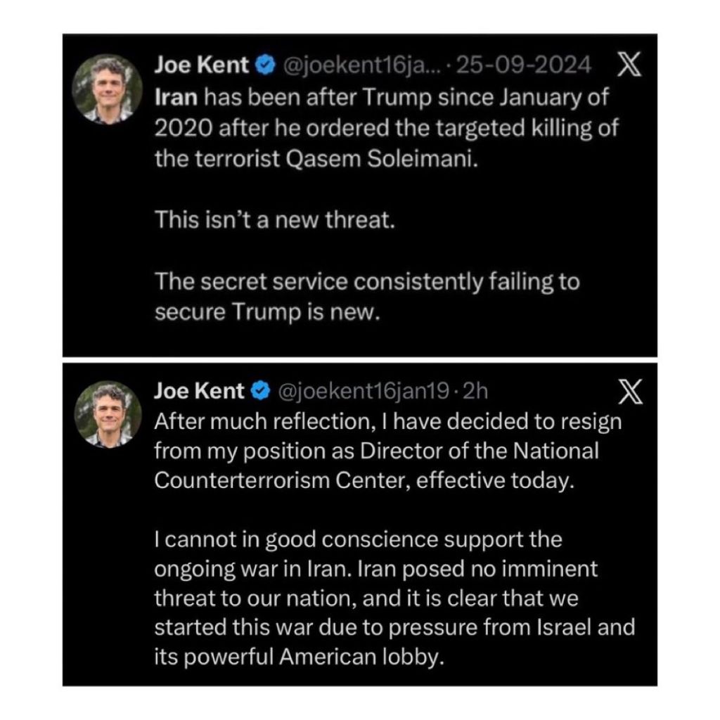 >IN A LETTER POSTED TO X, NATIONAL COUNTERTERRORISM CENTER DIRECTOR JOE KENT SAID THAT IRAN POSED "NO IMMINENT THREAT" TO THE US AND CLAIMED THE ADMINISTRATION "STARTED THIS WAR DUE TO PRESSURE FROM ISRAEL AND ITS POWERFUL AMERICAN LOBBY".