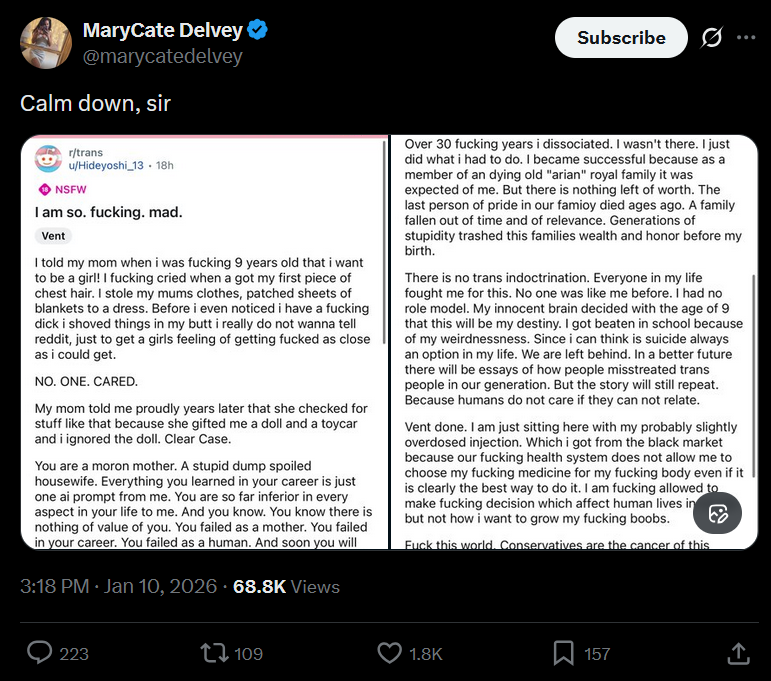 glad to see the tranny discord is out in force. on a scale of 1 to 'oops i stepped on a dead fish's head' how would you say your festering axe wound is doing today?