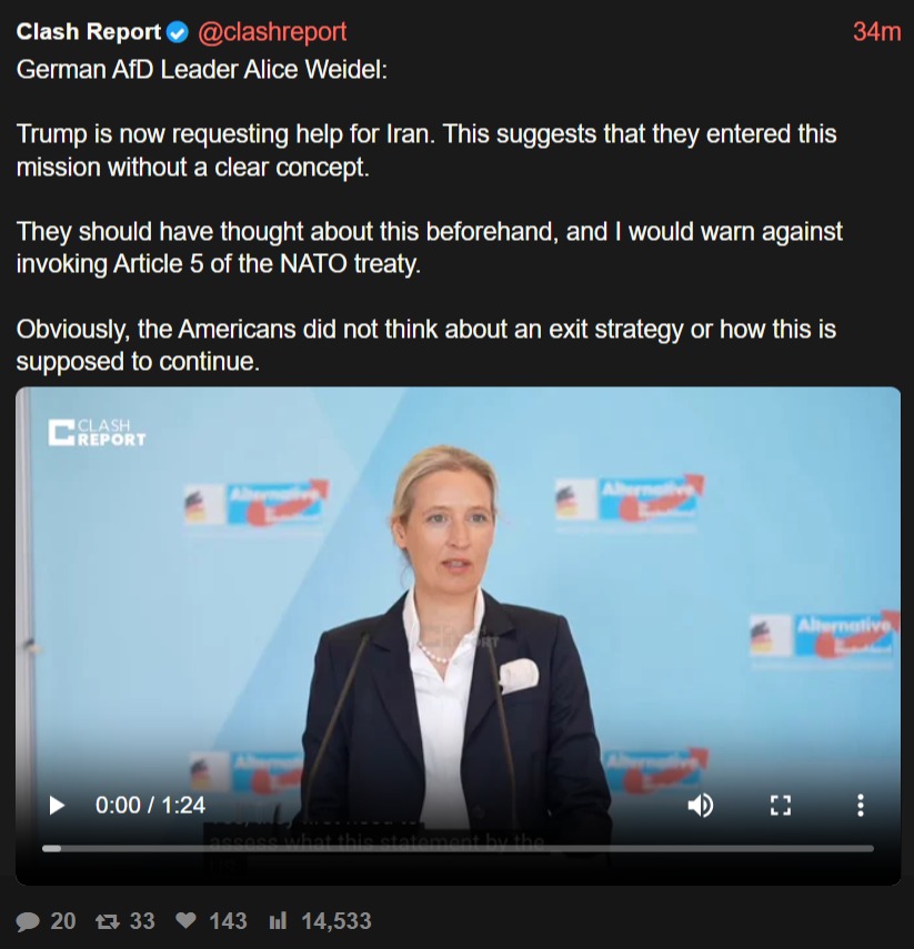 German AfD Leader Alice Weidel:Trump is now requesting help for Iran. This suggests that they entered this mission without a clear concept. They should have thought about this beforehand, and I would warn against invoking Article 5 of the NATO treaty.Obviously, the Americans did not think about an exit strategy or how this is supposed to continue