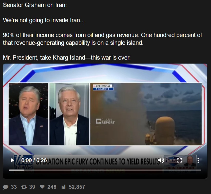 Senator Graham on Iran:We’re not going to invade Iran...90% of their income comes from oil and gas revenue. One hundred percent of that revenue-generating capability is on a single island. Mr. President, take Kharg Island—this war is over