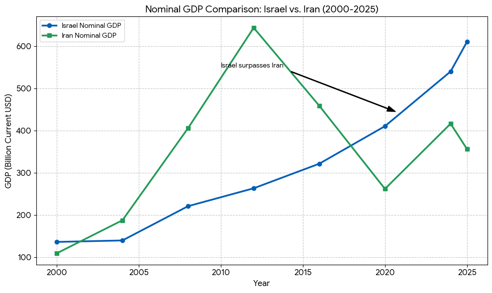 The primary cause for the decrease in Iran's GDP around 2011 and 2012 was the imposition of intensified international sanctions led by the U.S. At the same time, the welfare state of israel's growth was subsidized by America.