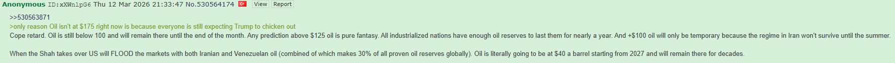 >>531036412>I think the USA capitulates in the next 10 daysWhat is even happening in the last 7 days? Look at it side by side>Israel does token assassinations to puff their chest, but other than Twitter upboats they get nothing out of it>USA is dead quiet since a week what are they even fucking doing? Bombing a cliff? What the fuckIran itself or by proxy attacks or destroys>every US base in the region>green zone>Israel infrastructure, cities, politicians, military leadersAnd the big news today is there is a controlled fire at a gas field in Iran. The response to which is total annihilation of Gulf energy. That sure showed Iran boy.