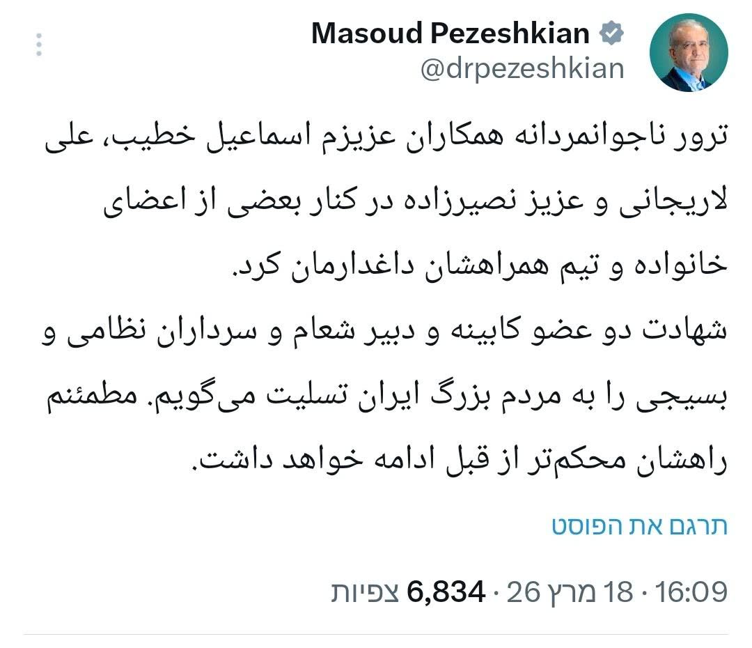 >>531033909Nothing to see here. Just the top intel chief in iran getting burned. within 24 hours of the president and another top IRGC commander. Didn't need them anyway. Slightly, temporarily, elevated oil prices win surly win the war for iran.>President of the Islamic regime in Iran, Masoud Pezeshkian, announces the death of Iranian Intelligence Minister Ismail Khatib, who was eliminated in an Israeli airstrike.Iranian 3 day SMO to defeat the great satan is going swimmingly.