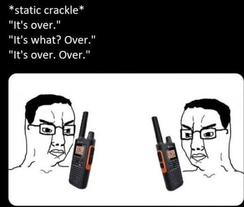 >>531048683''It's over. Over.'' ''What? What did you say? Is it over? Over.''''Yes, it's over. Over.''