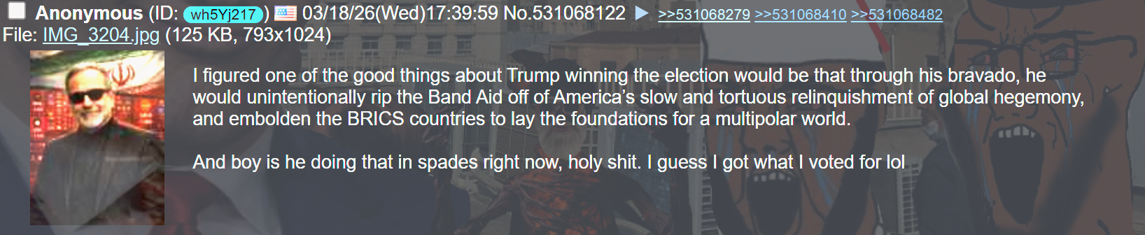 I figured one of the good things about Trump winning the election would be that through his bravado, he would unintentionally rip the Band Aid off of America’s slow and tortuous relinquishment of global hegemony, and embolden the BRICS countries to lay the foundations for a multipolar world.