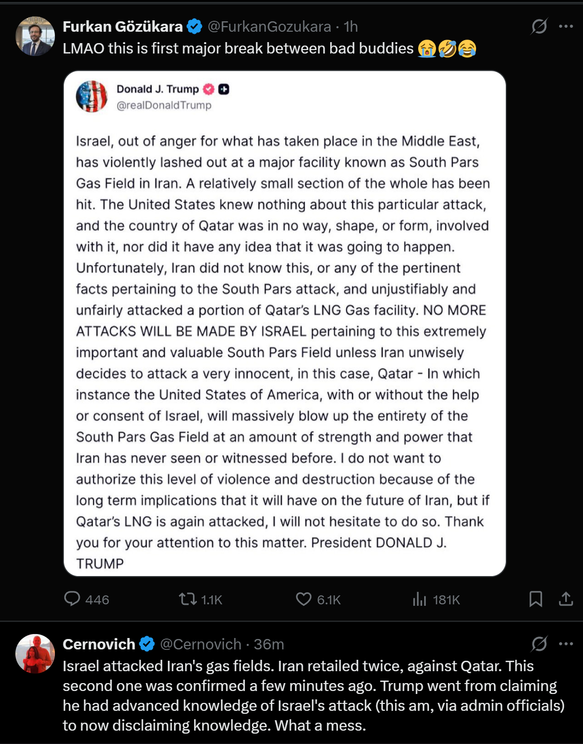 Trump knows that a serious attack on Qatar's LNG infrastructure will basically cripple the Qatari economy so, he is saying Israel did it, not him and will both sides please, please not do that again otherwise HE is going to escalate big time.