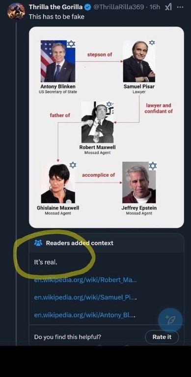 All of you are wondering why Pam Bondi is super resistant to release the full files, or wondering why Trump was somehow insane enough to speak about considering pardoning Ghislaine Maxwell, or wondering why there's been barely any prosecutions at all. The Epstein operation works like this: Get important people to the Island, use psychological tactics to make them do insane shit (doesn't matter if they were "manipulated" or not, we can't even tell), garner blackmail incase they are against the interests of Israel, even if it means using the most immoral acts possible... voila. America is your bitch. The moment any of this is publicized, we now have an apocalypse of zombie Israeli sleeper agents. Is it this fucking hard to figure out that we are doing the deeds of pedophiles who have used child abuse against us?