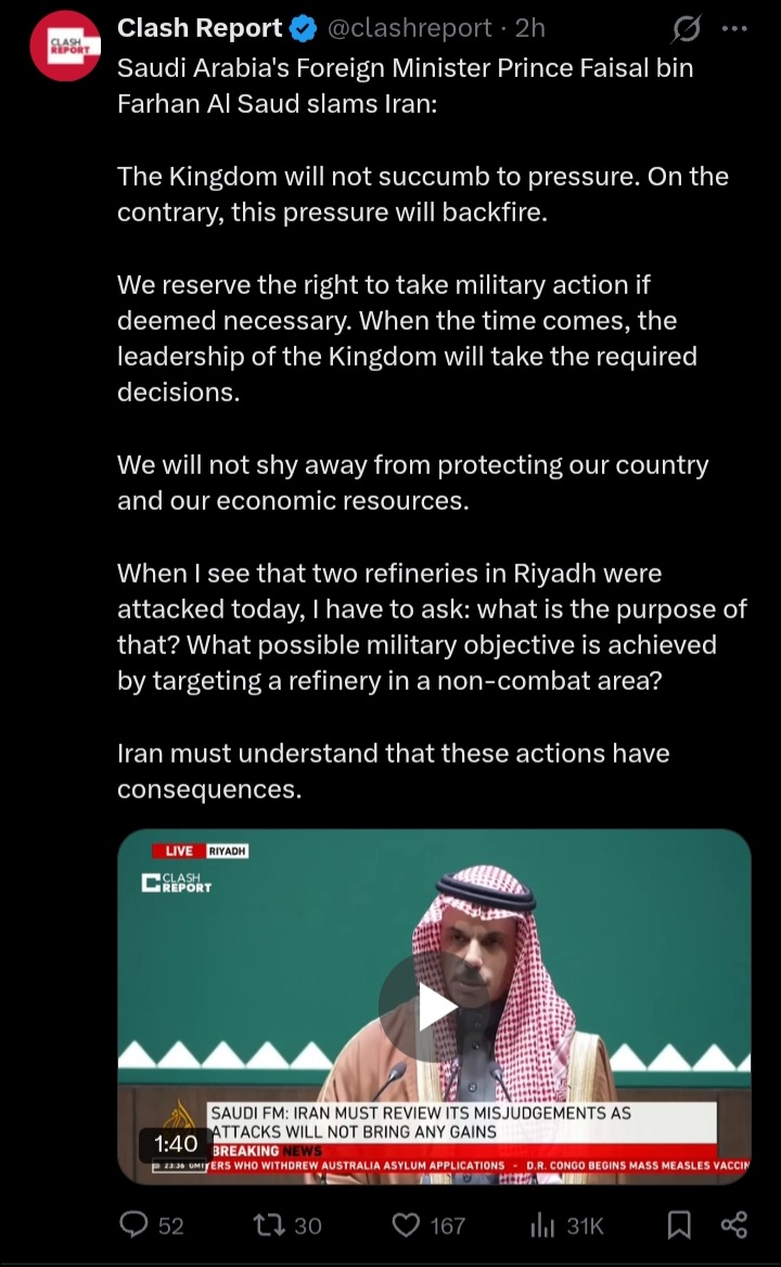Saudis just announced that they are ready to engineer a military response. Thats good, they will need it vs Houthis in Red Sea xDhttps://x.com/clashreport/status/2034466773823586583