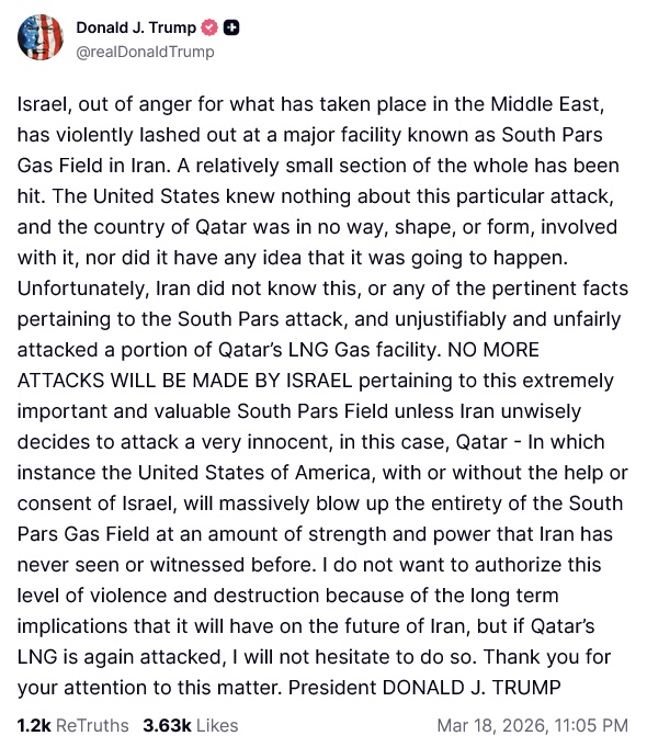 >Trump publicly vows Israel will not attack energy infrastructure in Iran again