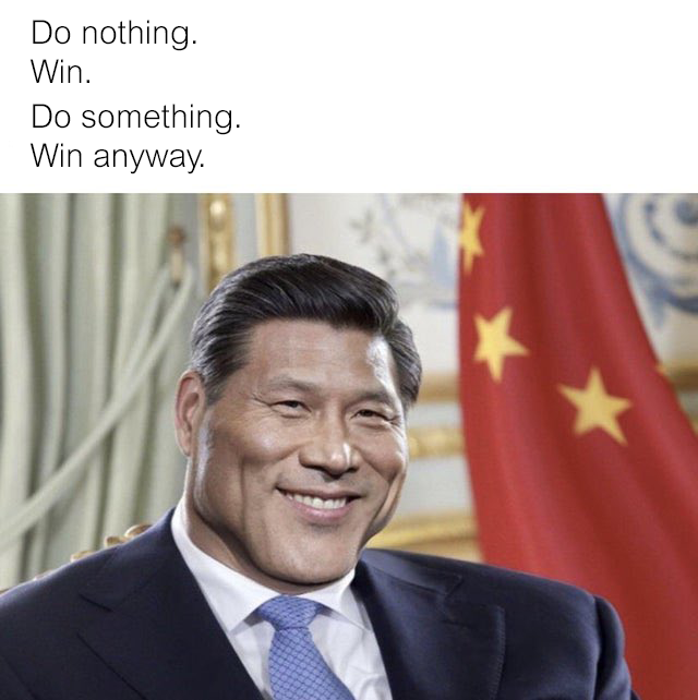 Those who do not need to do because everyone else is fucking up, do nothing. All Xi needs to do is chill out and let the US get dragged into a war with Iran. Easy victory without having to fire a single shot