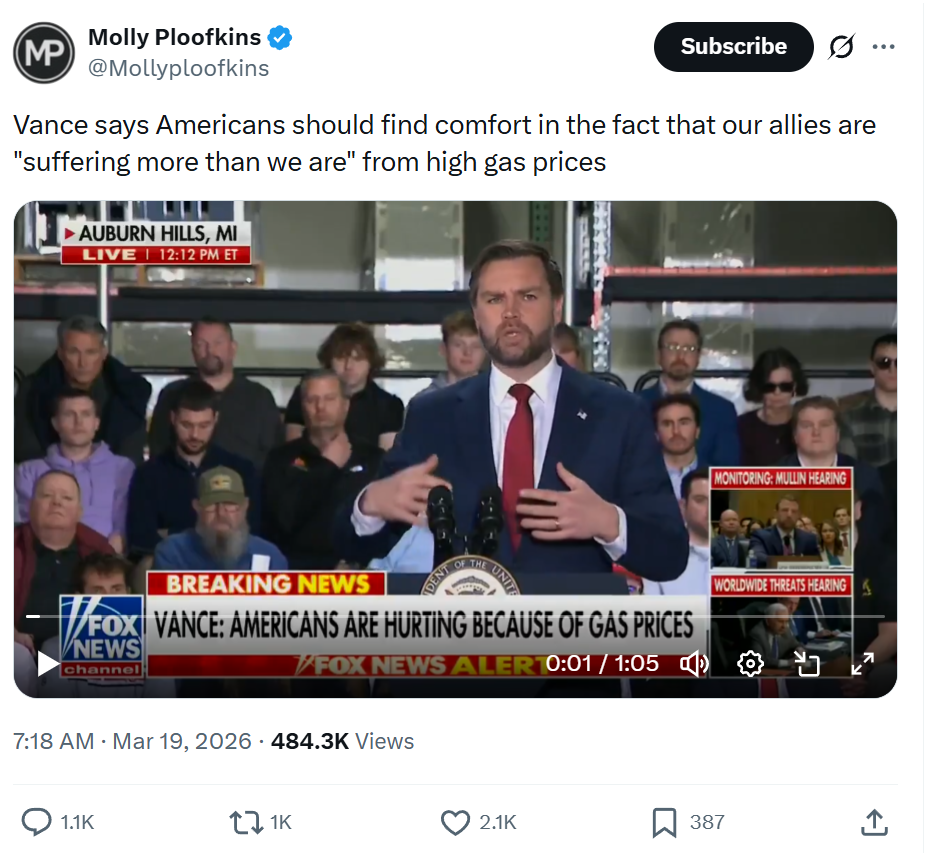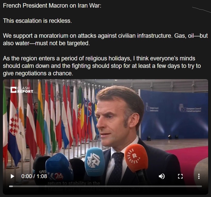 French President Macron on Iran War:This escalation is reckless.We support a moratorium on attacks against civilian infrastructure. Gas, oil—but also water—must not be targeted.As the region enters a period of religious holidays, I think everyone’s minds should calm down and the fighting should stop for at least a few days to try to give negotiations a chance ....